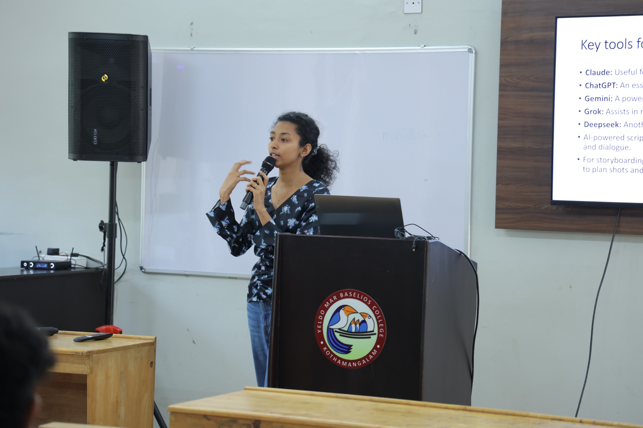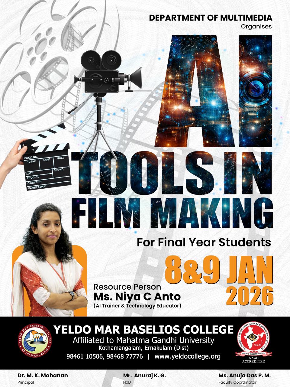 The Department of Multimedia at Yeldo Mar Baselios College proudly organized an exclusive workshop titled "Al Tools in Filmmaking" for Final Year Students on 8th & 9th January 2026. This hands-on session guided by Ms. Niya C. Anto, an acclaimed Al Trainer and Technology Educator, who enhanced students' practical mastery in Al-driven workflows for cinematic storytelling. This workshop also made them to unlock their Al's power to script the dynamic world of filmmaking and forefront of multimedia innovation, boosting employability in animation, film production, and creative tech. By the end of the session students were polished with their skills in Al-enhanced scriptwriting, storyboarding and efficient editing by empowering them to produce professional grade short films, build standout portfolios, and confidently tackle industry projects.