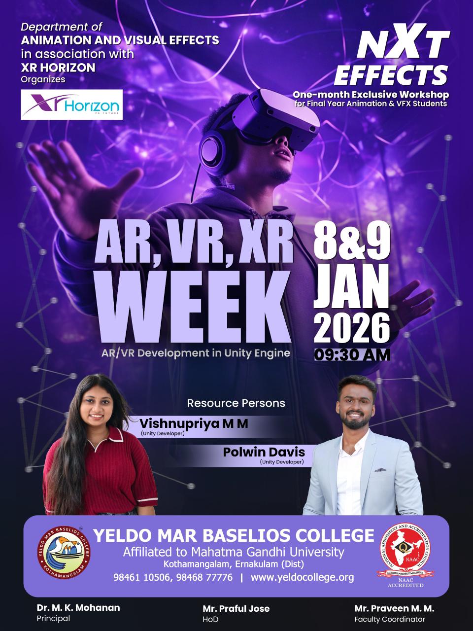 Elevate your skills, create groundbreaking experiences, and step into the XR horizon! The Department of Animation and Visual Effects at Yeldo Mar Baselios College, in association with XR Horizon, proudly presents an exclusive workshop tailored for Final Year Animation & VFX Students on 8th and 9th January 2026 at Yeldo Mar Baselios College. This intensive program spans with dedicated hands-on sessions explored AR/VR fundamentals, advanced Unity workflows, 3D modeling integration, interactive scripting, spatial audio, and performance optimization using tools like Unity's XR Interaction Toolkit and Shader Graph. Our visionary creators like Vishnupriya and Polwin transcend traditional animation, harnessing XR to craft experiences that blur worlds and redefine storytelling. This workshop enhanced the thriving career in the exploding XR industry-where our final-year students can become tomorrow's trailblazers.