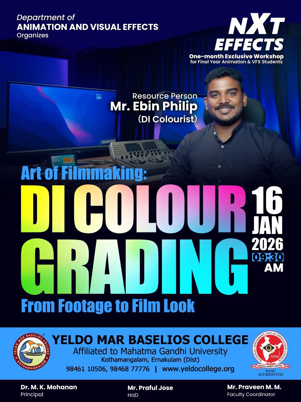 Dive into the transformative world of Digital Intermediate (DI) Colour Science with an intensive masterclass designed specifically for final-year students in the Department of Animation & VFX on 16 Jan 2026 at Yeldo Mar Baselios College. This workshop enhanced the students' journey on log-encoded RAW footage-captured in flat, high-dynamic-range formats , theatrical-grade deliverables ready for festival screens or streaming platforms. Guided by industry veteran Ebin Philip, a seasoned DI Colourist with credits on high-profile projects, mastered the ACES color-managed pipeline, leveraging node-based grading in industry-standard tools. This hands-on sessions include real-world shot breakdowns from log footage through to final graded masters, with opportunities to grade personal VFX reels. In the competitive realms of animation, VFX, and filmmaking, mastering DI colour grading is non-negotiable. This workshop equiped our students with pro-level skills to elevate raw dailies into cinematic masterpieces that help them to step into the industry as colour sorcerers ready to redefine storytelling, one luminous grade at a time. As the future of filmmaking glows brighter through timeless VFX epics that rival the silver screen.