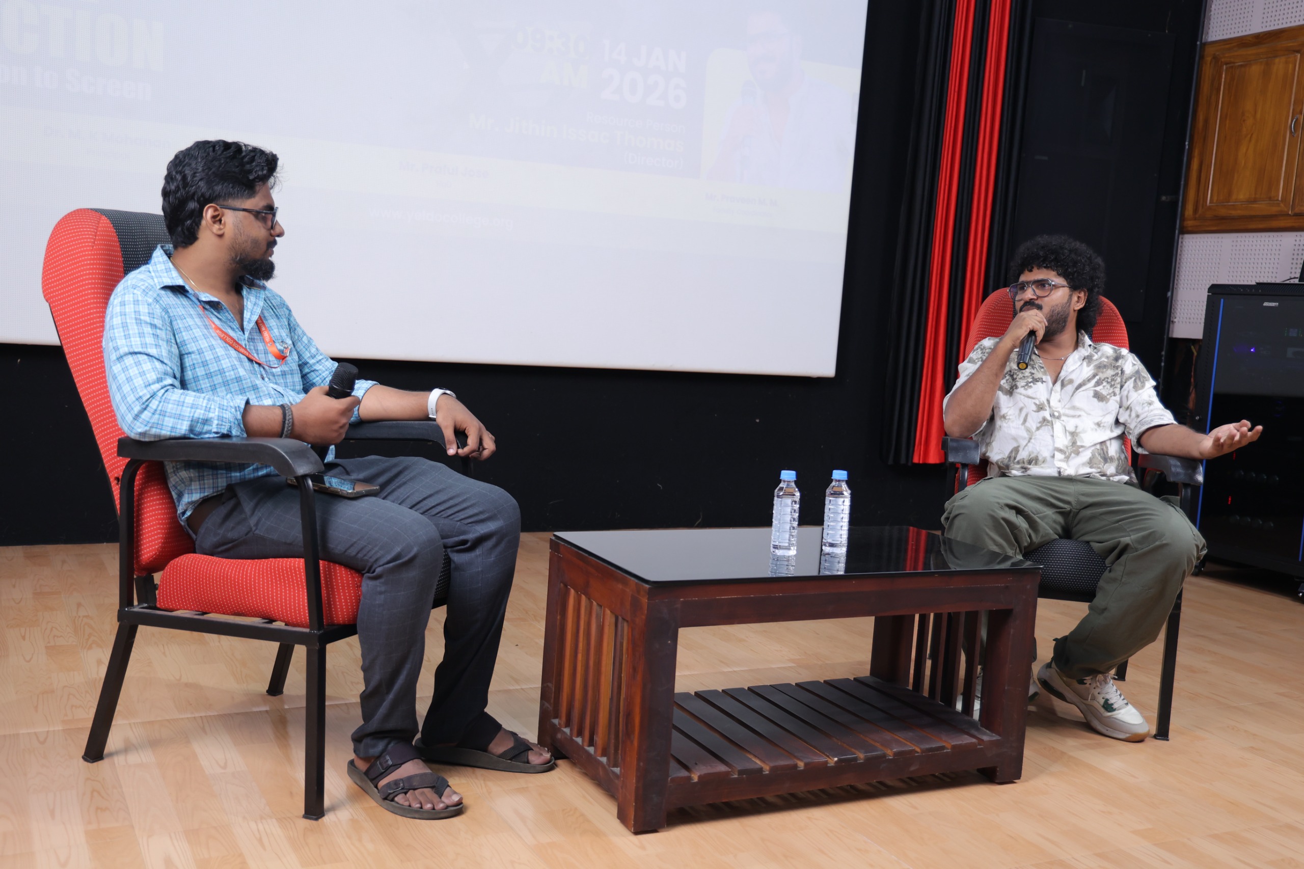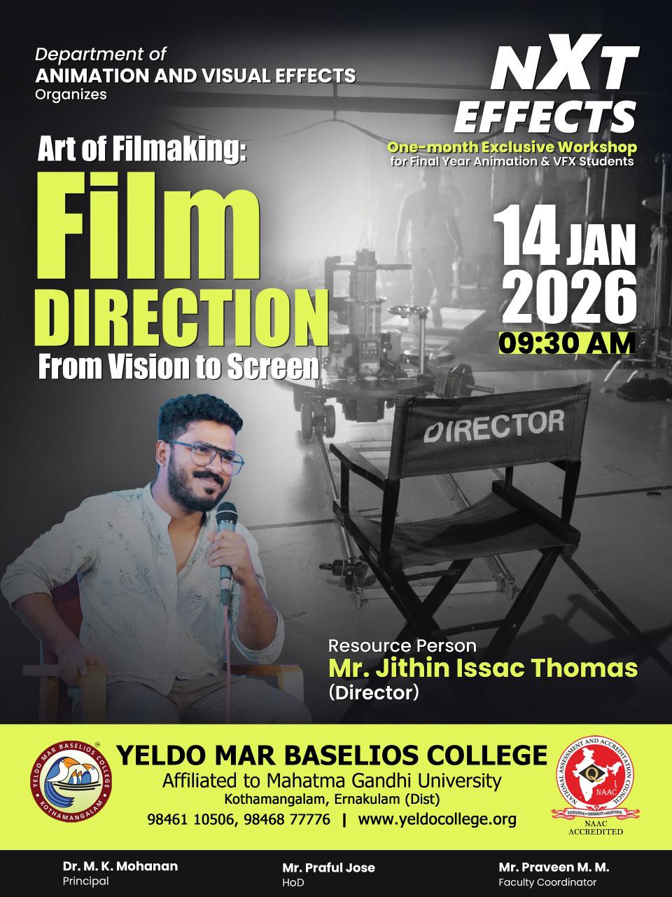 The Department of Animation & Visual Effects at Yeldo Mar Baselios College proudly presents an exclusive workshop tailored for final-year students: NXT EFFECTS: Art of Filmmaking -Film Direction from Vision to Screen! on January 14, 2026. This immersive session offered a rare opportunity to dive deep into the cinematic process with Mr. Jithin Issac Thomas, the acclaimed director behind standout films like Rekha (2023), the Netflix-hit Attention Please (2021)and Freedom Fight (2022). His visionary journey from initial script conception to final screen realization, gaining hands-on insights into storytelling, direction techniques, and overcoming real-world production hurdles. This workshop promised a profound impact for final-year students, empowering them to bridge academic learning with professional filmmaking. Students emerged with enhanced script-to-screen workflows, sharpened directorial instincts, and practical strategies for tackling narrative complexities and secure internships at leading VFX studios, in order to contribute various intercollegiate projects with Netflix-level polish. By the director's role, it fosters innovation in animation and visual effects, boosting portfolios and confidence for industry entry and transform their creative ideas into compelling narratives, equipping them with industry-ready skills that drive career success in the dynamic world of filmmaking.