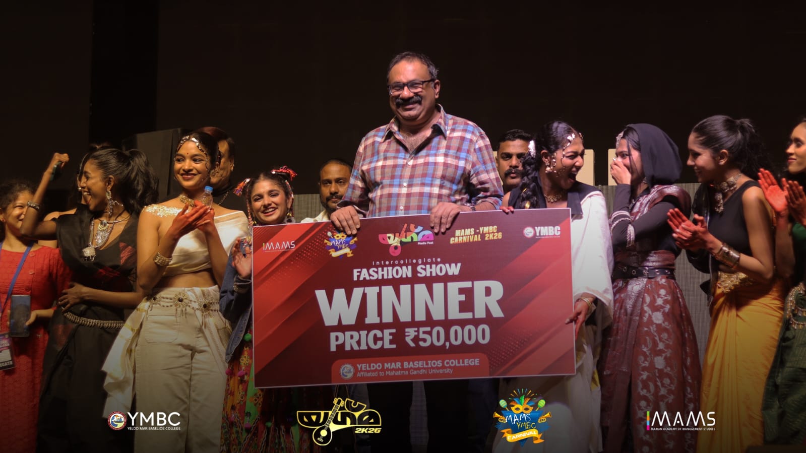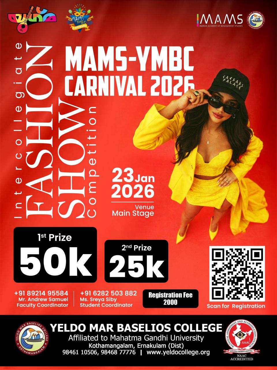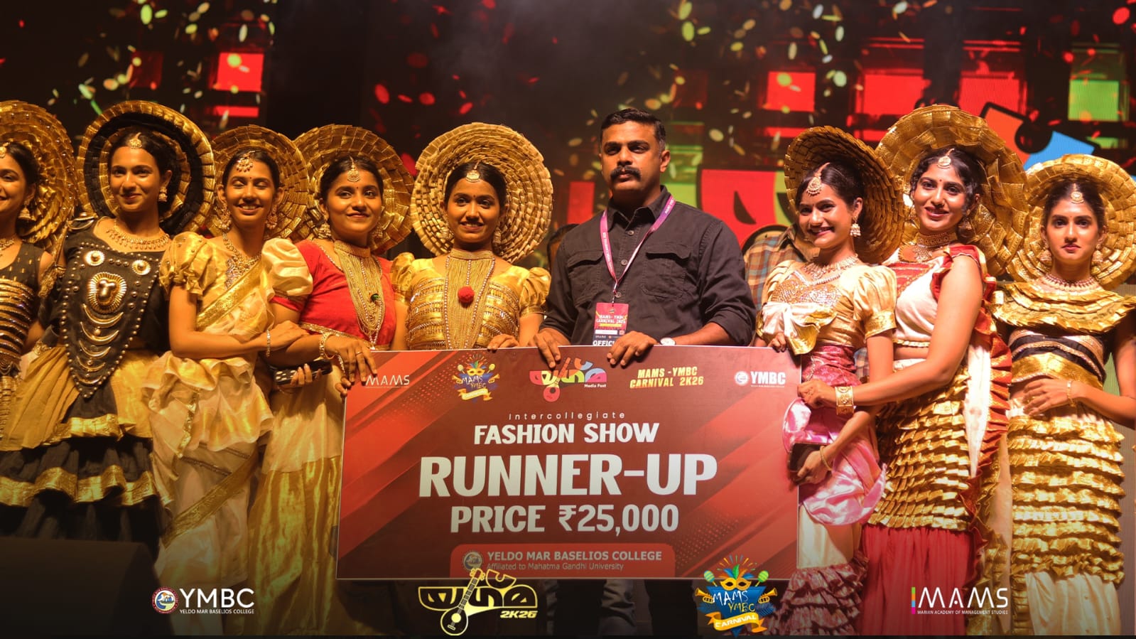 The MAMS-YMBC Carnival 2K26 | Yugma Media Fest's Intercollegiate Fashion Show exploded with couture creativity, graced by Chief Guest Dalu Krishnadas (International Fashion Groomer & Choreographer), alongside stars Cinda Padamadan (Miss South India 2024) and Jobin Joy (Fashion Designer & Stylist). St. Teresa's College, Ernakulam snatched 1st Prize ₹50K, while Rajagiri College of Management and Applied Sciences, Kakkanad claimed 2nd at 25K-pure glam, fierce struts, and unforgettable vibes! This wasn't just a show; it was a bold celebration of innovation, self-expression, and the future of Kerala fashion-where creativity struts eternal!