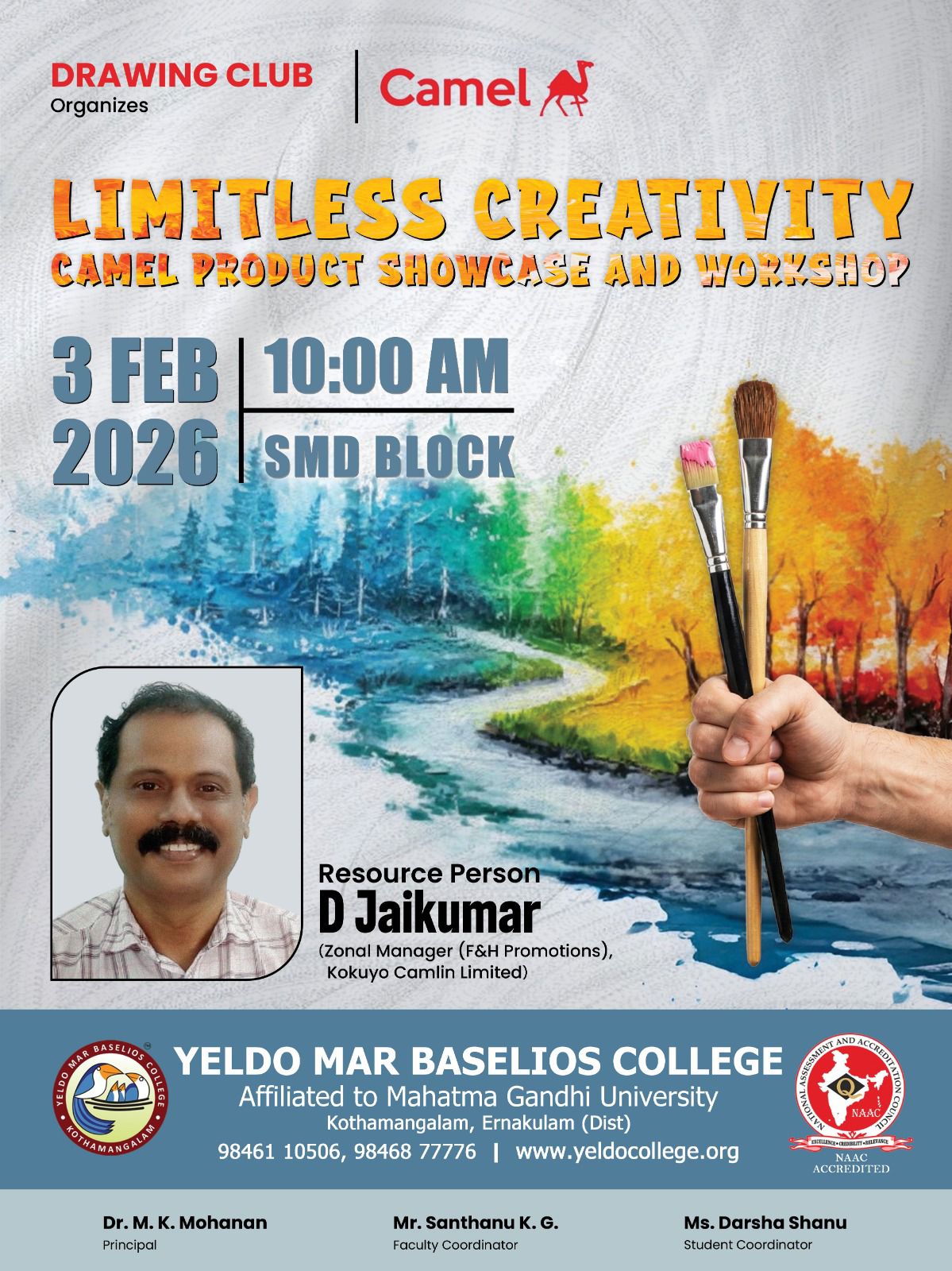 The Drawing Club at Yeldo Mar Baselios College ignited boundless imagination with Camel Creativity Unleashed!, a spectacular Product Showcase & Workshop held on 3 February 2026 at the SMD Block. Students dove into the world of artistic mastery under the expert guidance of D Jaikumar, Zonal Manager (F&H Promotions) from Kokuyo Camlin Limited, a seasoned industry leader renowned for driving creative promotions and empowering artists with cutting-edge tools from the iconic Camel brand. Jaikumar's dynamic session unveiled innovative Camel products-like premium colored pencils, sketch pens, and eco-friendly art supplies-through live demonstrations, revealing techniques for vibrant shading, precise detailing, and sustainable sketching that elevate everyday creativity. Students experienced a hands-on practice that elevated their drawing skills, exclusive product insights sparked fresh project ideas for animation, VFX, and graphic design portfolios, and interactive Q&A sessions delivered career-boosting tips on leveraging art tools in competitive fields like film production and fashion design. This event not only showcased student talents through live displays but also fostered networking with industry pros, equipping them with practical expertise to unleash their limitless potential.