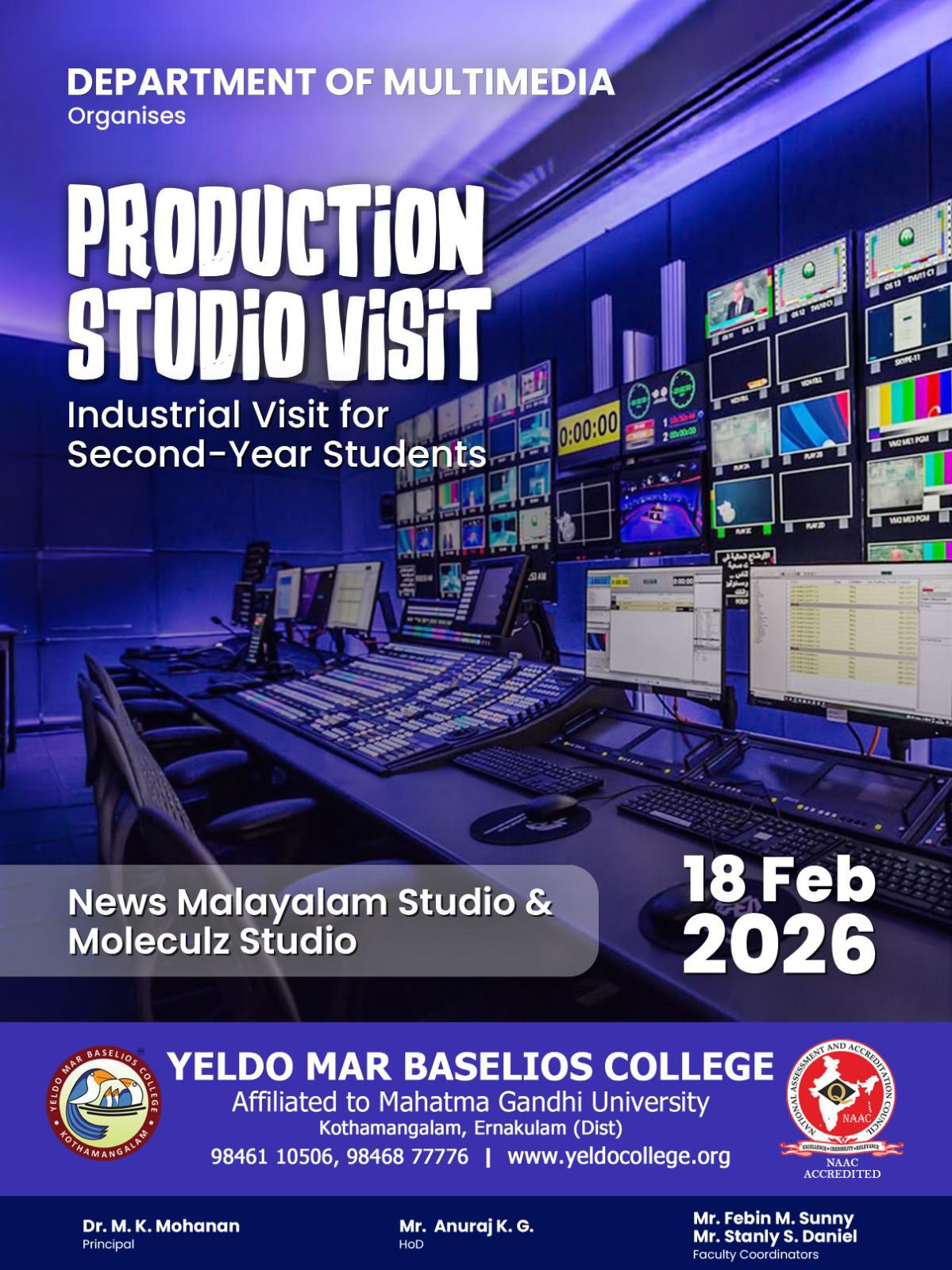 Production Studio Visit: Empowering Tomorrow's Multimedia Creators! The Department of Multimedia at Yeldo Mar Baselios College of Media & Design (YMBC) orchestrated an exclusive Industrial Visit for Second-Year students to the state-of-the-art News Malayalam Studio and cutting-edge Moleculz Studio on 18th February 2026. This immersive expedition propelled students beyond theoretical frameworks into the pulsating heart of real-world production pipelines, fostering hands-on exposure to broadcast journalism workflows and nonlinear editing suites. At News Malayalam Studio, participants delved into live OB van operations, multi-camera switching paradigms, and Avid Media Composer workflows, witnessing seamless ingest-to-air timelines under high-pressure deadlines. Industry mentors elucidated chroma key compositing techniques and LUT grading protocols, demystifying how raw footage transforms into polished primetime bulletins. Meanwhile, Moleculz Studio unveiled proprietary motion graphics pipelines powered by Adobe After Effects and Cinema 4D, showcasing particle simulations, procedural modeling, and real-time ray-tracing renders that redefine immersive storytelling. This synergy of broadcast and digital production environments equipped students with actionable insights into pre-vis storyboarding, asset management in Shotgun pipelines, and collaborative dailies review processes-bridging academia with media industry. Meaningful networking sessions with sound designers mastering Dolby Atmos mixes and colorists fine-tuning HDR deliverables sparked mentorship connections, igniting passion for career trajectories. YMBC's commitment to experiential learning ensures our multimedia trailblazers graduate not just with degrees, but with production-ready portfolios and unshakeable industry acumen. Stay tuned for more field immersions that level up your craft!