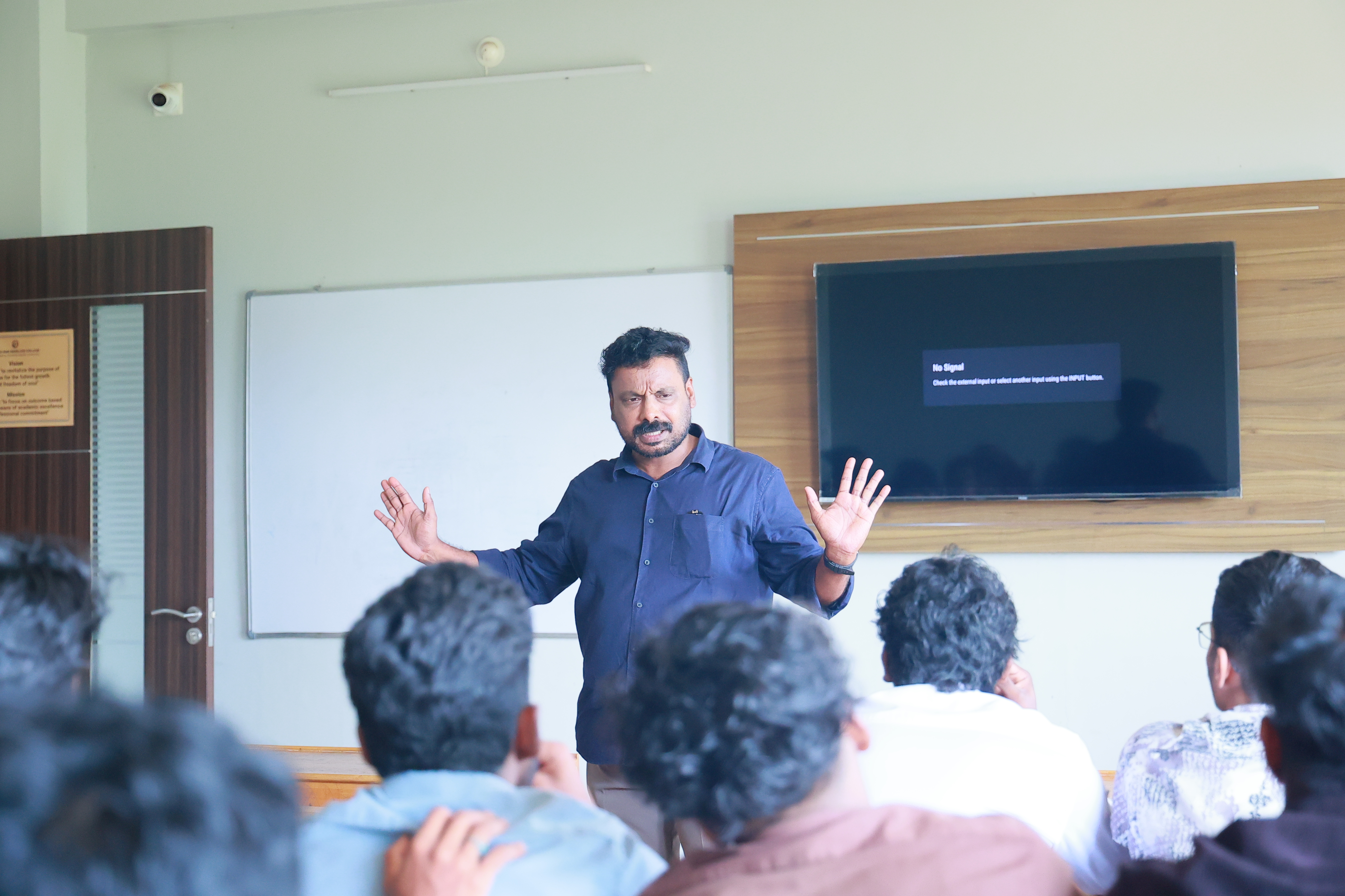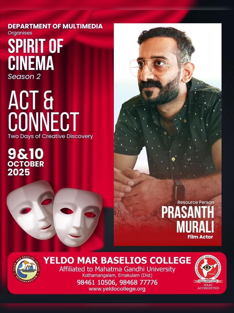 A two-day workshop, Act & Connect: Creative Discovery, led by Prasanth Murali, a film actor, recognized for his versatile acting and contributions behind the scenes in the film industry, drew aspiring students and encourage their creativity. The event organized by the Multimedia Department at Yeldho Mar Baselios College on October 9-10, 2025, offered hands-on acting exercises, monologue coaching, and collaborative storytelling sessions. Prasanth shared practical insights into on-camera presence, audition strategies, and maintaining authentic performance under pressure. Participants engaged in scene work, improvisation, and near-film set simulations, receiving constructive feedback. The event culminated in student showcases, highlighting innovative narratives, technical skill growth, and a shared passion for media art.
