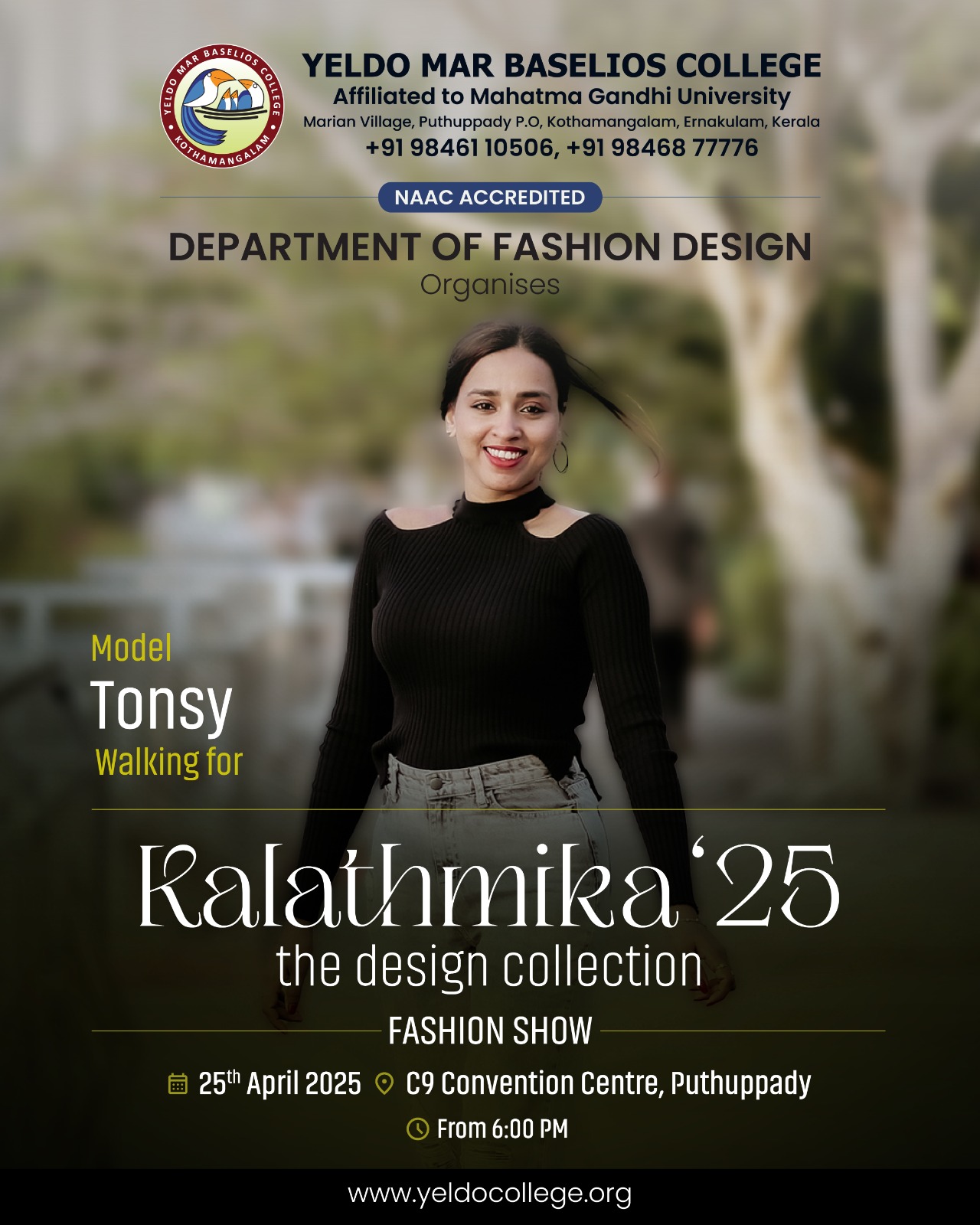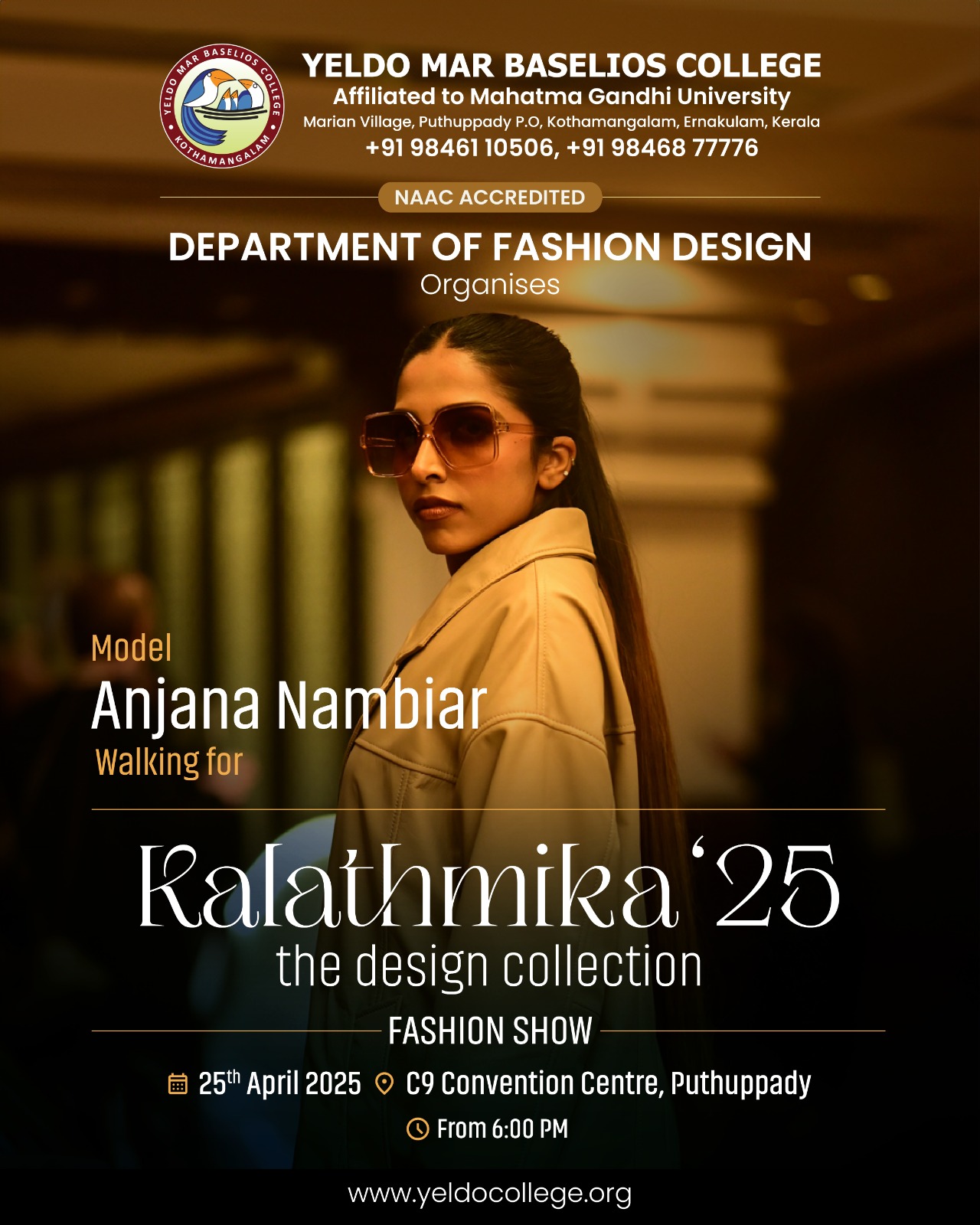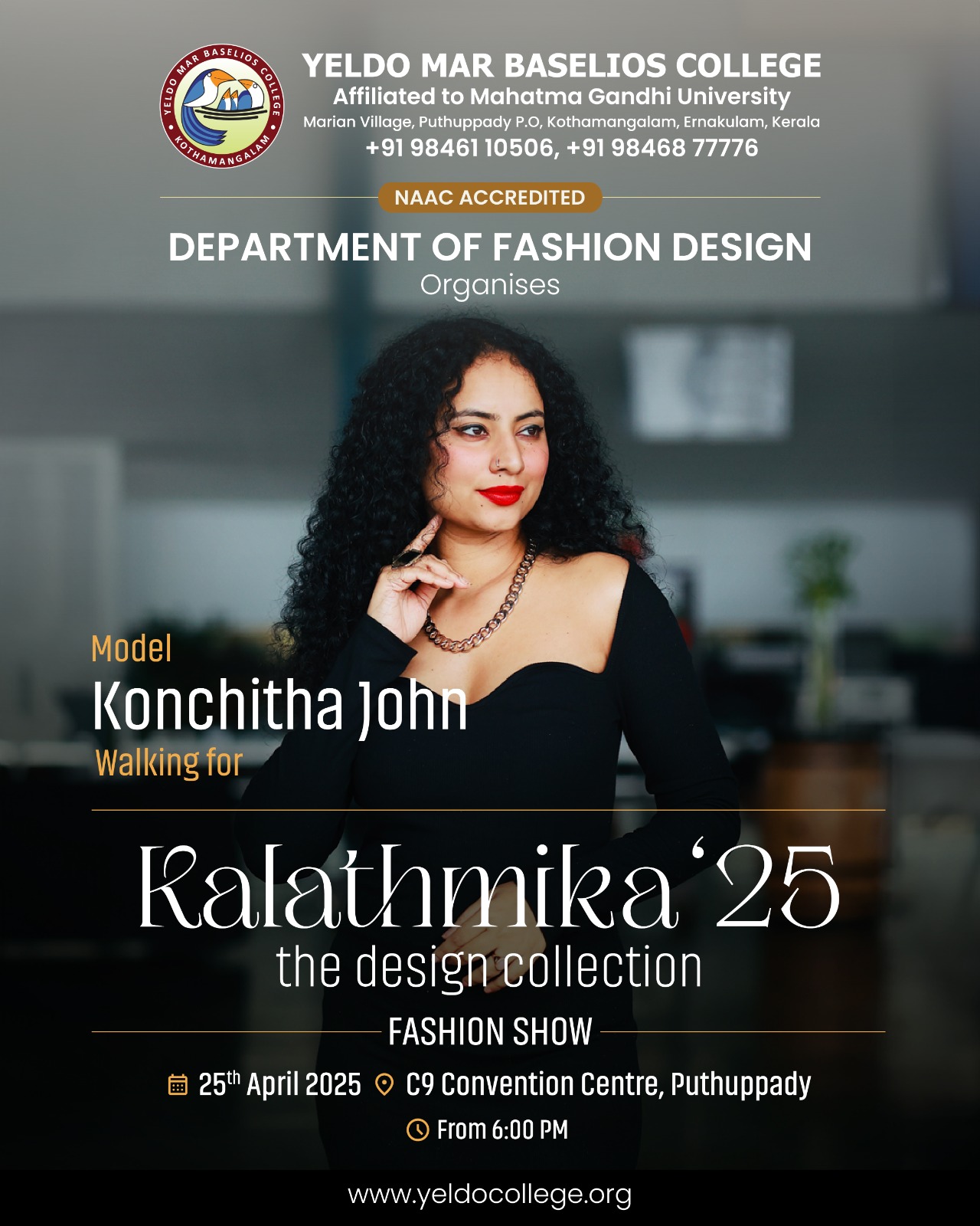 Kalathmika '25, presented by the Department of Fashion Design, Yeldo Mar Baselios College, celebrates the artistic spirit and vision of emerging designers. This grand design collection unfolds at the C9 Convention Centre, Puthuppady, on 25th April 2025. The evening was graced by the charismatic South Indian actress and television star Mridhula Vijai as Chief Guest. The event featured a spectacular fashion show where 31 final-year students showcased their creativity. The show was expertly choreographed by renowned fashion choreographer Jude Felix, who brought the students' designs to life with his innovative and captivating choreography. Professional Models like Anjana Nambiar, Konchitha John and Tonsy, graced the ramp by presenting innovative designs with elegance and flair, reflecting the creative spirit of the Department of Fashion Design.
