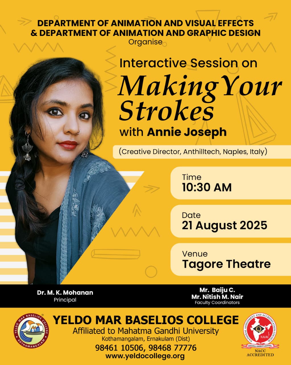 The Department of Animation and Visual Effects and the Department of Animation and Graphic Design proudly present an exclusive interactive session titled "Making Your Strokes"on 21 August 2025 at Tagore Theatre,Yeldo Mar Baselios College. An engaging session by Annie Joseph, a Creative Director at Anthilltech Italy, known for her innovative approach to digital art and shared insights from her international journey-offering participants fresh perspectives on the ever-evolving world of animation and visual design. Students explored the art of visual storytelling and engaged in constructive dialogue, exploring the nuances of design language within the dynamic fields of animation and graphic arts.