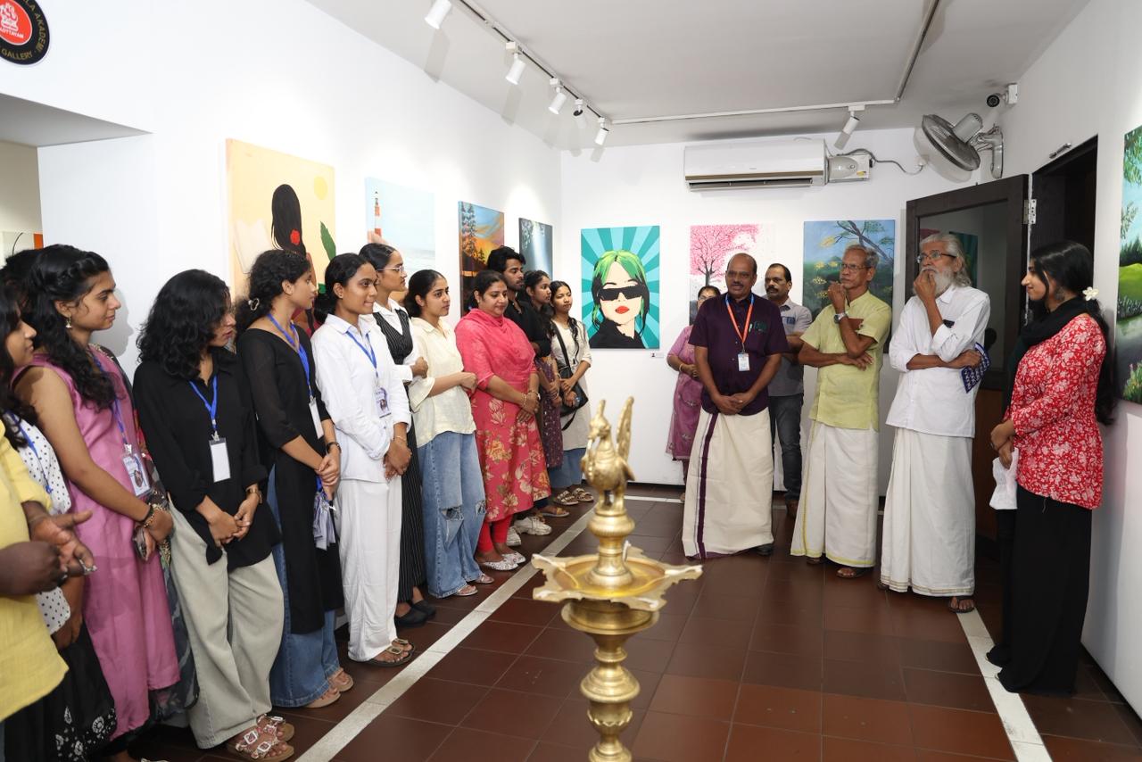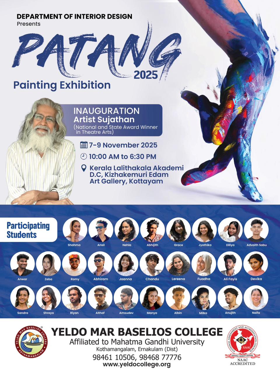 The Department of Interior Design proudly presents PATANG 2025, a three-day painting exhibition celebrating vibrant expressions and artistic imagination from November 7 to 9, 2025, between 9:30 AM and 6:30 PM at the Kerala Lalithakala Akademi Art Gallery, Kottayam, and experience the visual harmony shaped by young creative minds of Yeldo Mar Baselios College. The event was inaugurated by the renowned artist Mr. Sujathan, whose works have profoundly influenced contemporary visual practice in Kerala. The exhibition features the artistic contributions of promising students who have distinguished themselves through conceptual clarity and technical mastery in visual expression. Their works serve as a foundational interior design principles-such as harmony, contrast, scale, and sustainable material usage-can be translated into two-dimensional art. This thematic focus aligns with the department's goal to cultivate design literacy that transcends conventional architectural boundaries and inspires an expanded visual dialogue within the art community.