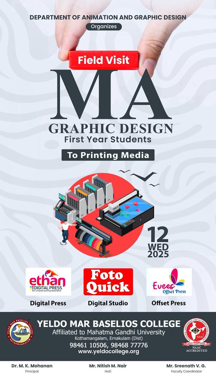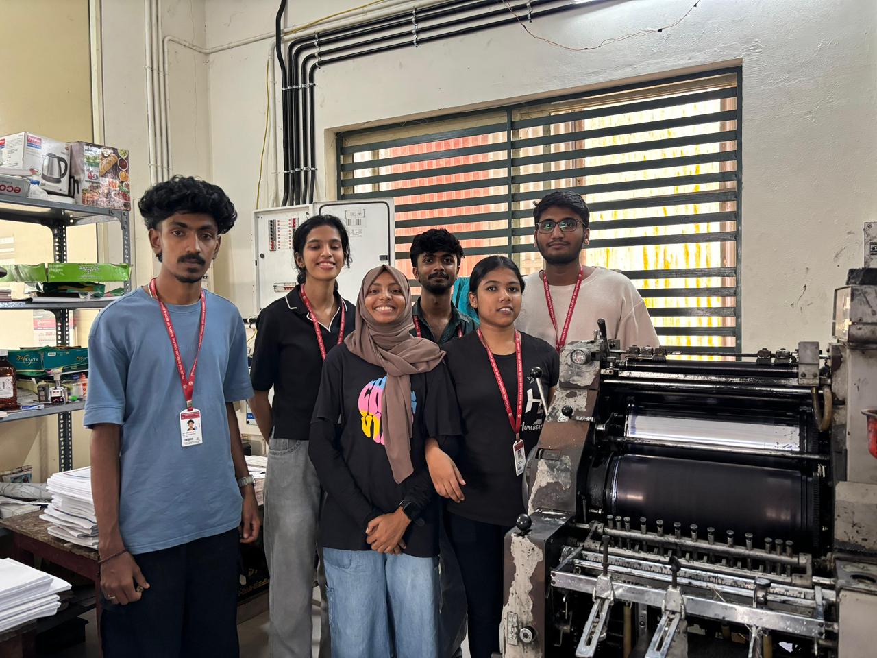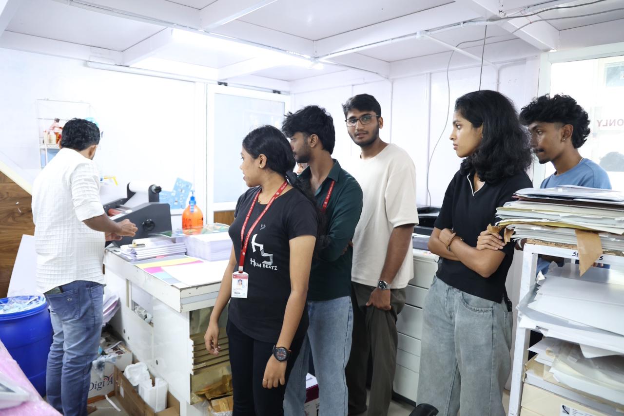 The Department of Animation and Graphic Design organized an academic field visit for the first-year MA Graphic Design students on 12 November 2025.The field visit aimed to strengthen the students' industry orientation by connecting theoretical design knowledge with real-world production environments, thereby fostering comprehensive professional development. The students visited Ethan Digital Press and photo Quick Digital Studio, where they observed the functioning of advanced digital printing systems and design reproduction processes. They also explored Offset Press, gaining an understanding of traditional offset printing techniques and production workflows. Through direct interaction with industry professionals and observation of pre-press, printing, and finishing operations, the students enhanced their understanding of material handling, color management, and quality control-key aspects that define the standards of professional print production. This visit was designed to provide experiential learning opportunities and practical exposure to the contemporary practices of the printing and media industry.