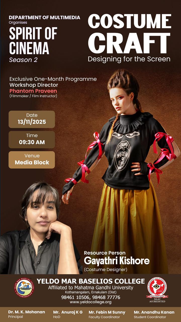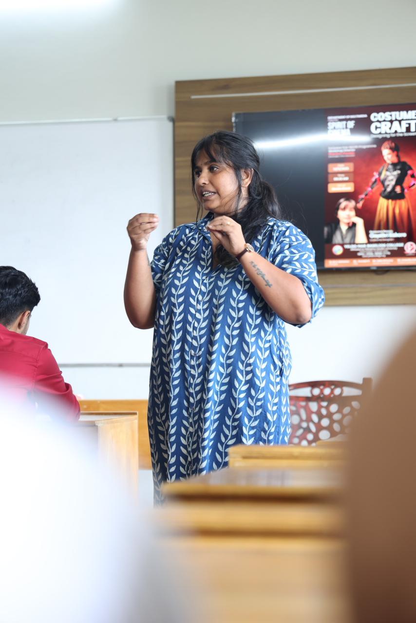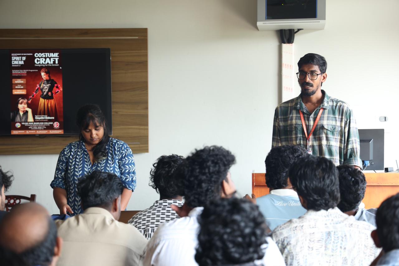 The Department of Multimedia proudly unveils Spirit of Cinema - Season 2, a creative learning initiative dedicated to celebrating the intricate artistry of film production and visual storytelling. The intensive programme titled Costume Craft: Designing for the Screen held on 13 November 2025 at 9:30 AM in the Media Block, offered participants a platform to engage in hands-on sessions, peer collaboration, and in-depth discussions on the artistry and craftsmanship that encourage participants in the conceptual, aesthetic, and technical dimensions of costume design within the cinematic framework. The inaugural session features renowned costume designer Gayathri Kishore as the resource person, sharing her professional insights into the creative process, aesthetic decisions, and collaborative dynamics that bring cinematic costumes to life with directorial vision, genre tone, and production design. Her expertise spans the entire workflow-from script analysis and research-driven concept sketches to material sourcing, color mapping, and continuity planning for screen projects. This workshop integrated participants visual mood boarding, character prototyping, fabric styling, and on-screen color theory to build comprehensive visual identities for film characters.