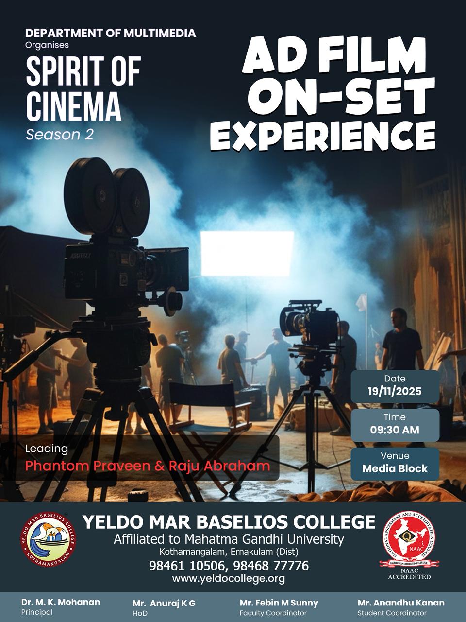 Spirit of Cinema - Season 2: Ad Film On-Set Experience" was an event organized by the Department of Multimedia at Yeldo Mar Baselios College on 19th November 2025. It offered students a live, real-world experience of making a commercial advertisement under the guidance of acclaimed filmmakers Phantom Praveen and Raju Abraham. The ad film shoot featured the model Anna Prasad, who is a well-known Indian dancer, choreographer, actress, and digital content creator. This workshop provided a unique opportunity for students interested in filmmaking and advertising to witness and participate in a professional ad film production. The filmmakers organised a team set up professional equipments including cameras, lighting, editing, color grading, sound design, and visual effects enhancements to create a polished, engaging ad film. Voiceovers, music, and graphics are integrated to complete the storytelling. This hands-on workshop allowed students to witness and participate in each step, from planning and casting through to live shooting and post-production insights, gaining valuable professional filmmaking and advertising experience.