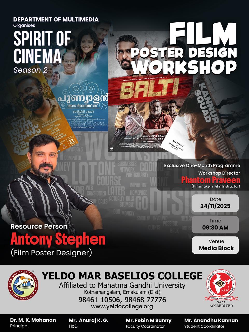The Department of Multimedia at Yeldo Mar Baselios College proudly presents an exclusive Film Poster Design Workshop, designed to immerse participants in the art and craft of cinematic visual communication held on 24th November 2025. The session was guided by Antony Stephen, a professional Film Poster Designer, who demonstrated the technical and aesthetic processes behind conceptual poster creation-from composition and typography to tone mapping and visual hierarchy. Through this industry-aligned masterclass, students explored professional workflows integrating Adobe Creative Suite tools, cinematic color grading techniques, and promotional design strategies used in film marketing. The session emphasized ideation through mood boards, key art development, and digital sketching pipelines-transforming storytelling into powerful visual campaigns. The workshop not only honed creative direction and digital artistry but also encouraged participants to visualize cinema as an experiential brand-where every frame, font and hue narrates emotion and identity. It also serve as a creative platform for Multimedia students to engage with professionals, decode evolving digital trends, and translate cinematic emotion into design excellence.