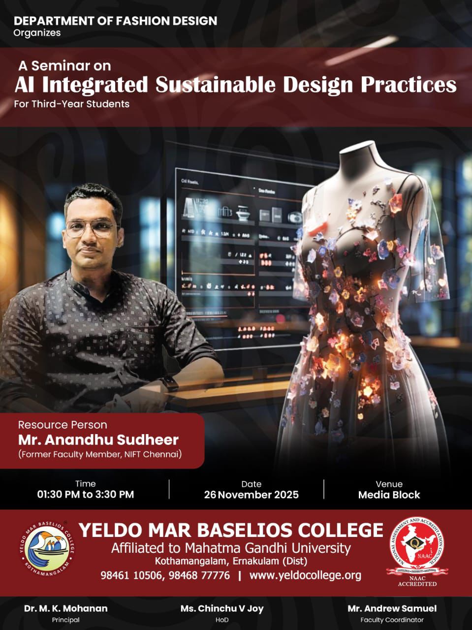 The Department of Fashion Design proudly presents an insightful seminar on Al-Integrated Sustainable Design Practices, featuring Mr. Anandhu Sudheer, former faculty member of NIFT Chennai on 26 November 2025, from 1:30 PM to 3:30 PM at Yeldo Mar Baselios College, to discover how cutting-edge Al tools are revolutionizing design thinking and enabling responsible creativity that respects both people and the planet. It also enhanced the transformative fusion of technology and sustainability in fashion. The seminar inspired designers, students, and industry professionals to rethink traditional fashion paradigms and embrace innovative approaches that prioritize environmental consciousness without compromising artistic integrity. This session crafted the design practitioners to achieve insights into smart materials, data-driven trend forecasting, and sustainable lifecycle analytics - all critical for advancing design thinking beyond aesthetics to environmental impact.