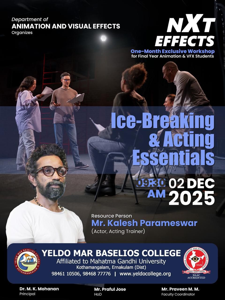 The Department of Animation and Visual Effects is pleased to present the Ice-Breaking & Acting Essentials session, part of the NXT EFFECTS workshop series for final-year Animation & VFX students, held on 02 December 2025 at Yeldo Mar Baselios College. This session was expertly conducted by Mr. Kalesh Parameswar, a respected Actor and Acting Trainer, who guided students through the essential principles of performance. Focusing on foundational acting techniques, the session aimed to deepen participants' ability to infuse animation with realism and emotional depth. By refining their understanding of character expression and storytelling, students enhanced their capacity to bring animated characters authentically to life. This module played a crucial role in developing nuanced acting skills that elevate the overall impact of their creative work. Students gained valuable insights into bringing animated characters to life with greater authenticity and expressiveness. They were overwhelmed by many appreciating the practical approach that helped deepen their storytelling abilities and boost their confidence in character portrayal. This foundational module proved instrumental in equipping students with nuanced acting skills that will significantly enhance their creative work.