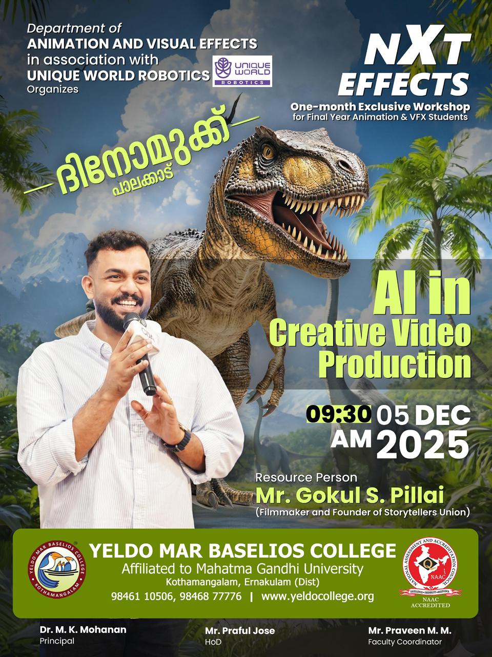 The Department of Animation & Visual Effects, in proud partnership with Unique World Robotics, invites final-year Animation & VFX students to an immersive workshop: Al in Creative Video Production on December 5, 2025, at Yeldo Mar Baselios College for hands-on sessions led by Mr. Gokul S. Pillai, acclaimed filmmaker and founder of Storytellers Union. With his wealth of industry experience, Gokul shared the pioneering Al techniques, insider storytelling secrets, and practical tools to revolutionize video production workflow. The sessions combined theoretical foundations with hands-on demonstrations, equipping attendees with practical skills to integrate Al into professional animation and VFX pipelines. This workshop aligns with emerging global standards in computational creativity and prepares students for competitive roles in media and cinematic industries. Students explored the transformative role of artificial intelligence in modern video production and automating narrative scripting, motion capture enhancement, and procedural animation through large language models (LLMs) and reinforcement learning for seamless VFX pipelines. This mastering Al-driven creativity, where technology meets human ingenuity. sharpen the student's skills, connect them with fellow creators, and unlock new possibilities in animation and VFX.