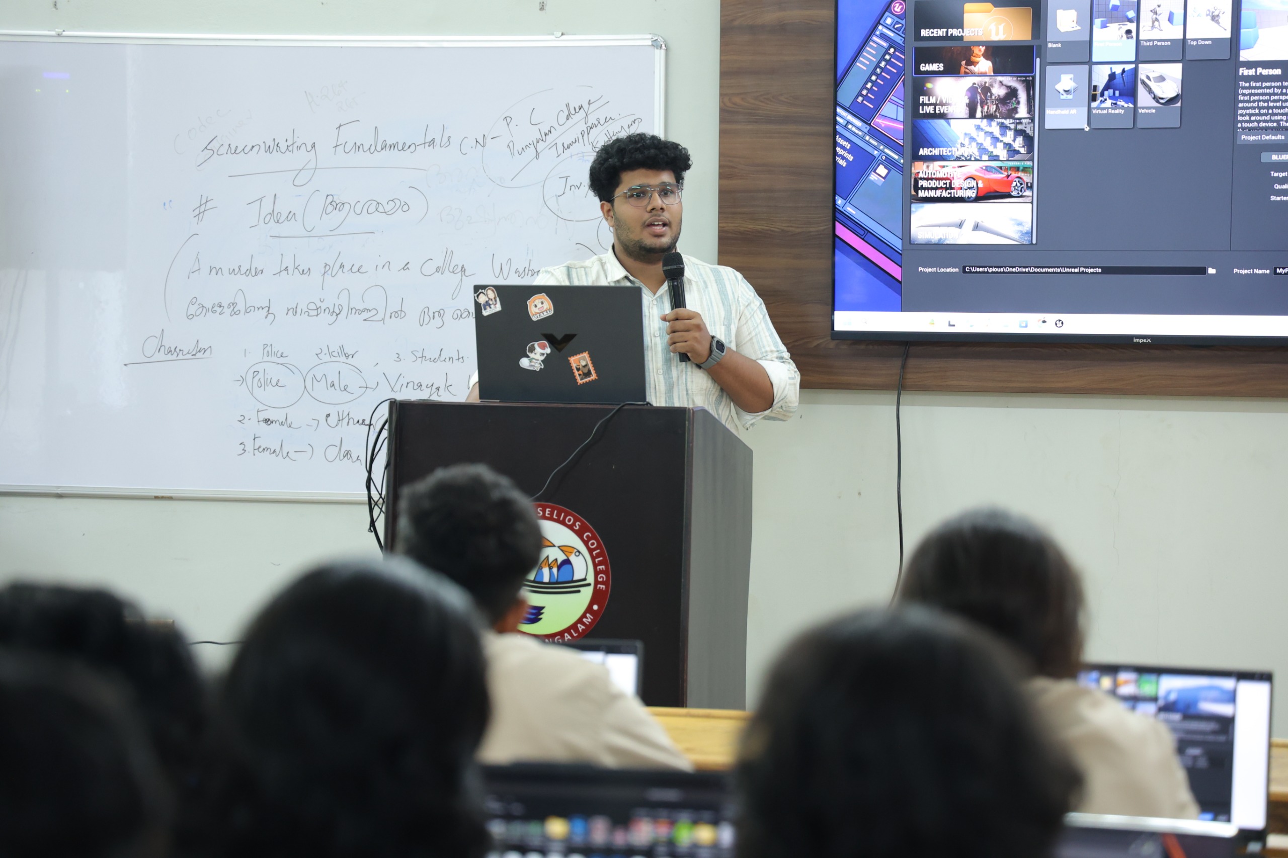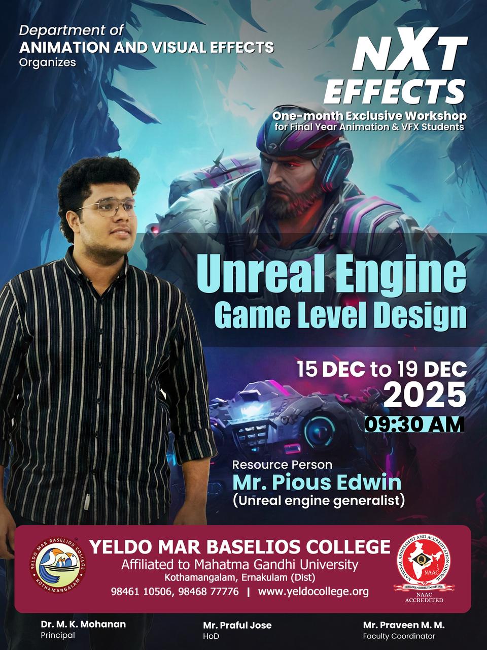 The Department of Animation and Visual Effects at Yeldo Mar Baselios College, Kochi, proudly presents NXT EFFECTS-an exclusive, hands-on workshop designed exclusively for final-year students. Immerse yourself in the world of professional game development with Unreal Engine Game Level Design, from December 15-19, 2025 at Yeldo Mar Baselios College.The session featured by renowned resource person Mr. Pious Edwin is a seasoned Unreal Engine Generalist with 8+ years in game development and VFX. His credits include indie hits featured at GDC. A certified Epic Games developer, he specializes in blueprint-driven pipelines, Niagara simulations, and real-time rendering. This intensive 5-day session is your gateway to professional-grade VFX and game design skills. The sessions transformed our students understanding of gameplay mechanics and experienced real-world tips made complex effects. It also elevated their portfolio, gain industry insights, and secure a competitive edge in animation and gaming careers.
